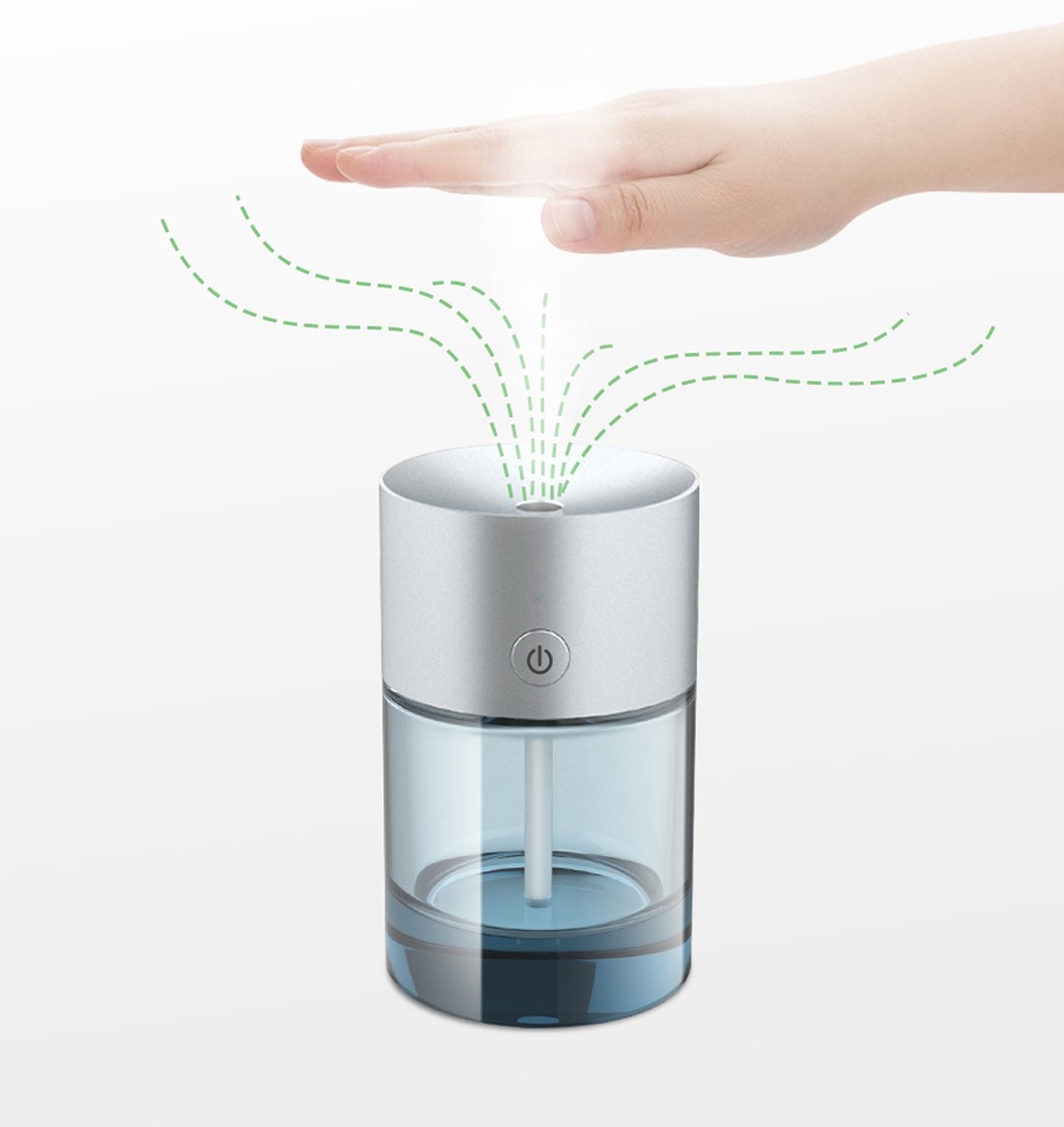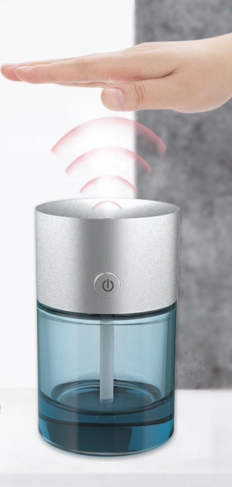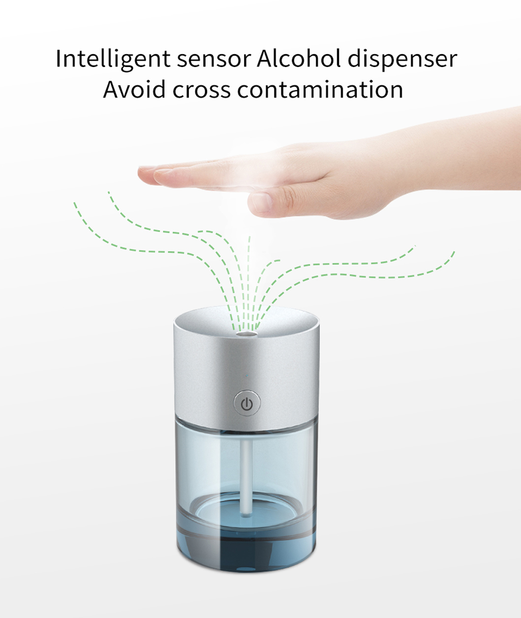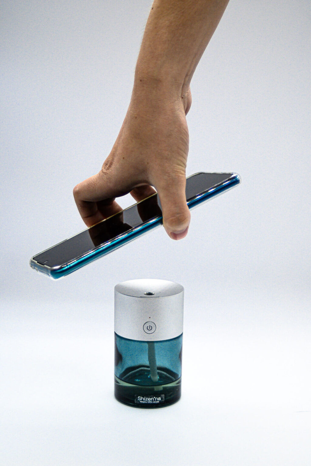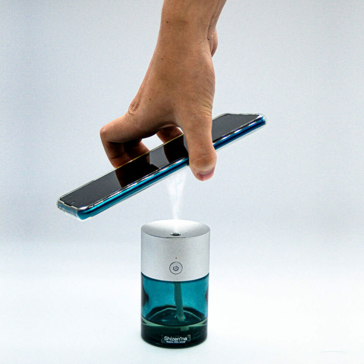 Dispensador automàtic i mans-lliures de solució alcohòlica desinfectant, per a la fórmula especial D-Eucaliptol de Shizen’na que higienitza amb aroma natural els estris personals com mascaretes, claus, telèfon mòbil… o per a cartes de restaurant, guants, etc. Funciona quan es tapa la cèl·lula superior polvoritzant la solució en intervals de 10 segons seguits.