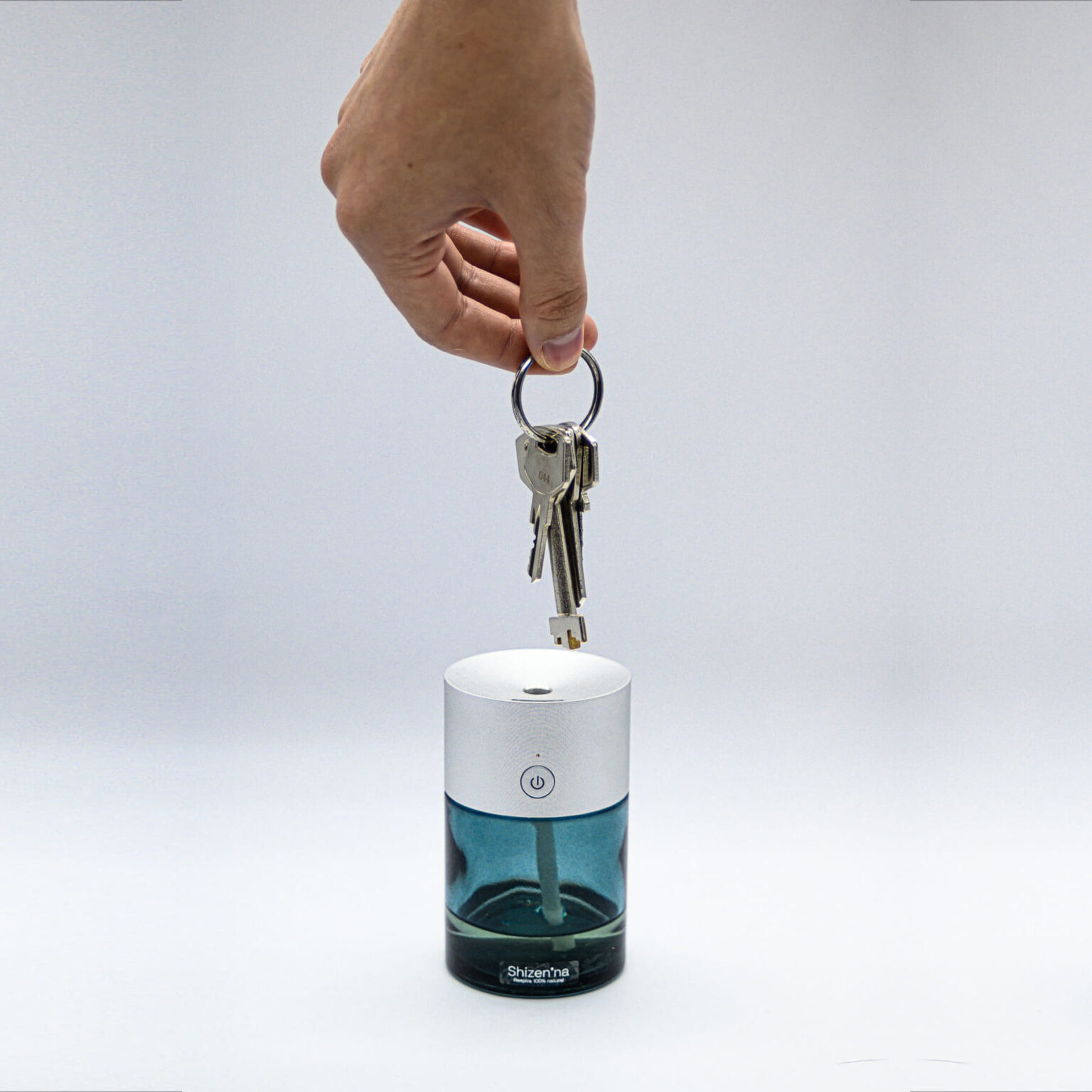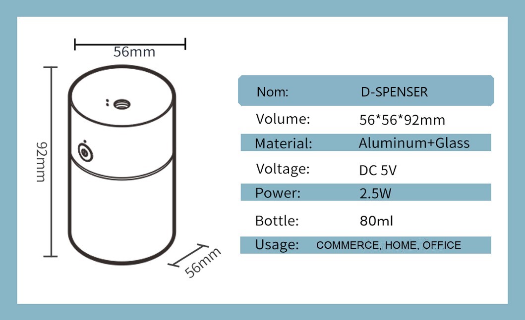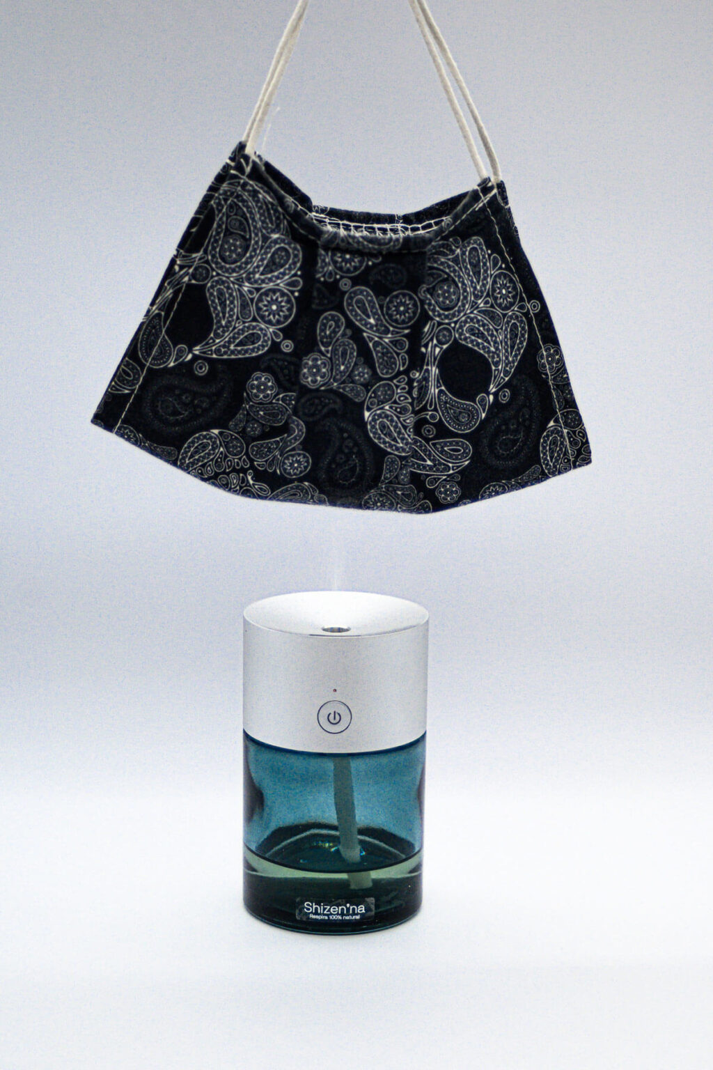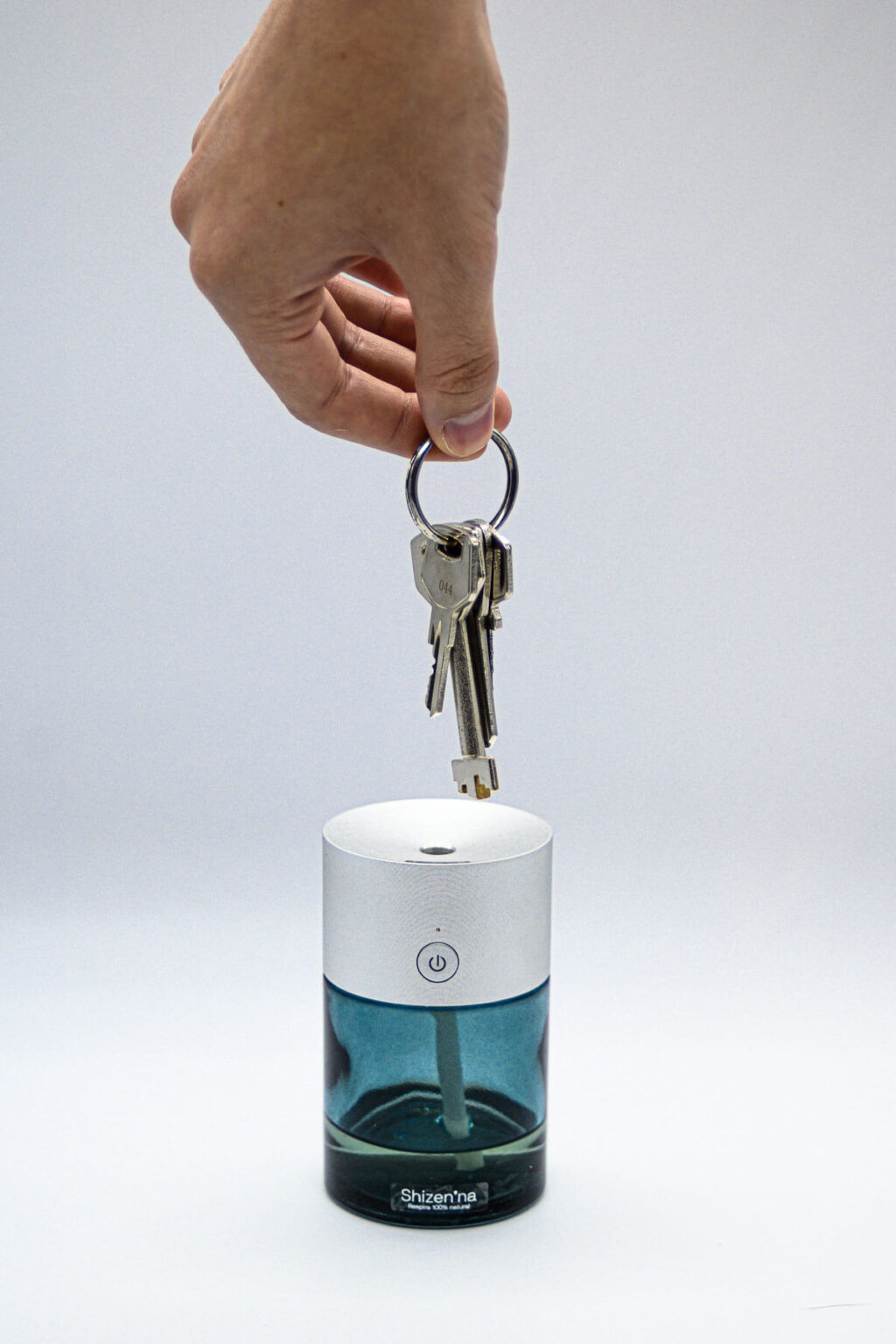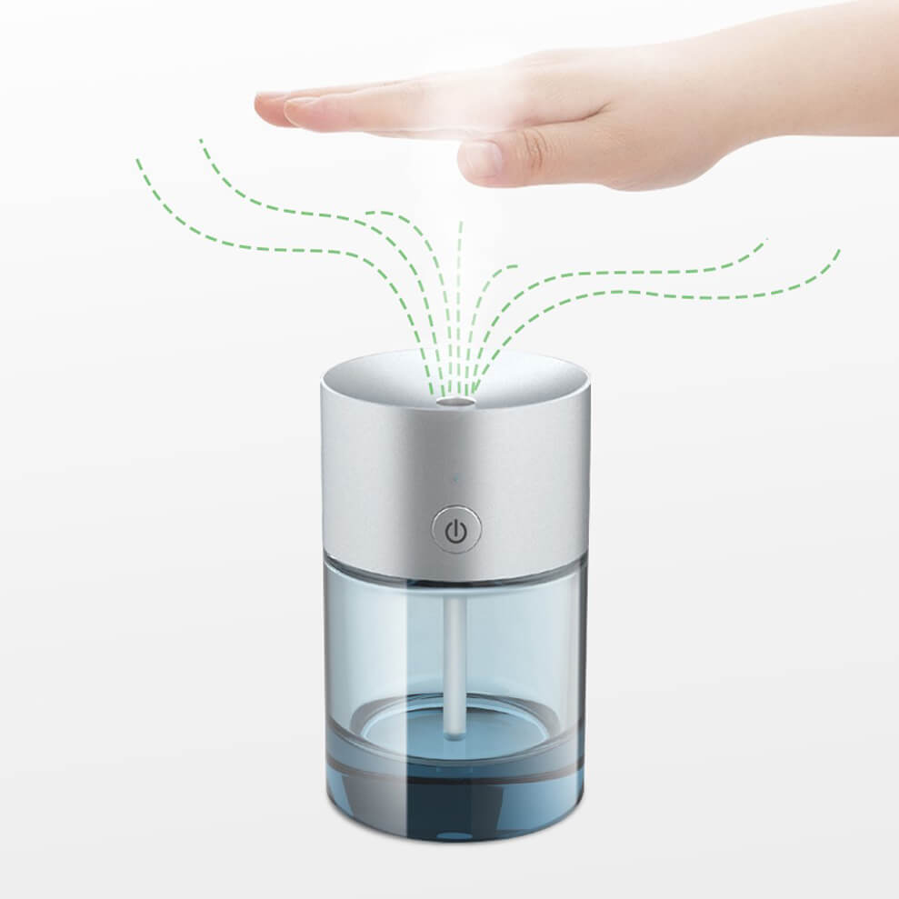 Dispensador automàtic i mans-lliures de solució alcohòlica desinfectant, per a la fórmula especial D-Eucaliptol de Shizen’na que higienitza amb aroma natural els estris personals com mascaretes, claus, telèfon mòbil… o per a cartes de restaurant, guants, etc. Funciona quan es tapa la cèl·lula superior polvoritzant la solució en intervals de 10 segons seguits.